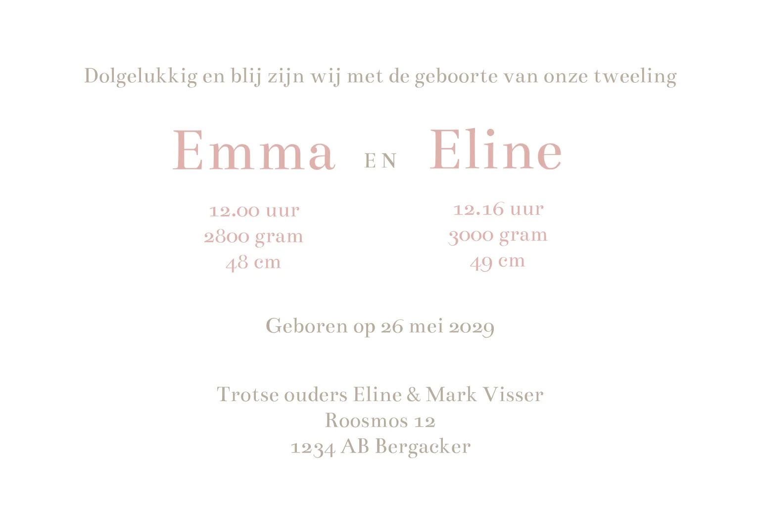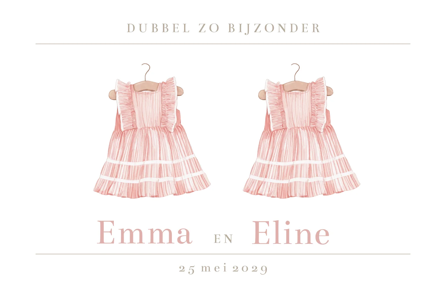 Een lief en klassiek geboortekaartje voor de geboorte van een tweeling. Op de voorzijde staan twee roze jurkjes. Een mooi geboortekaartje voor de geboorte van twee kleine meisjes.