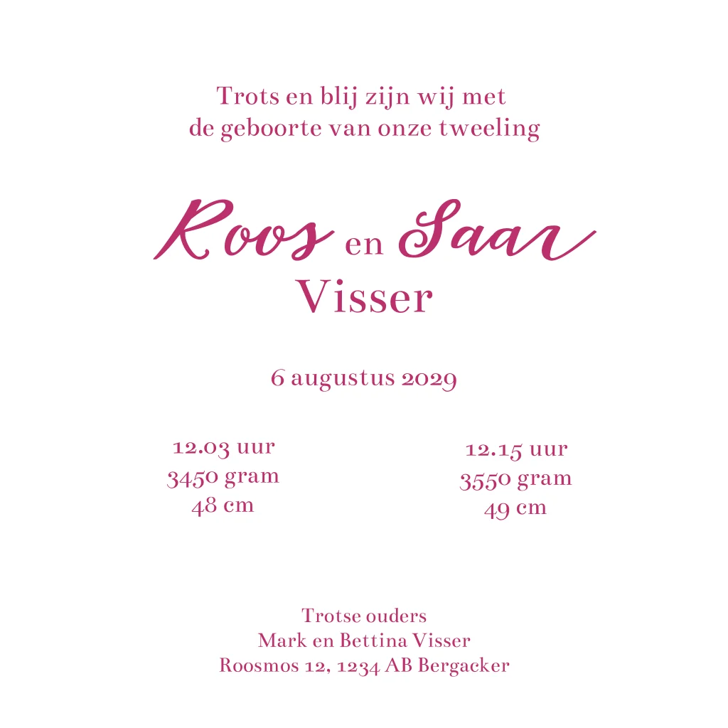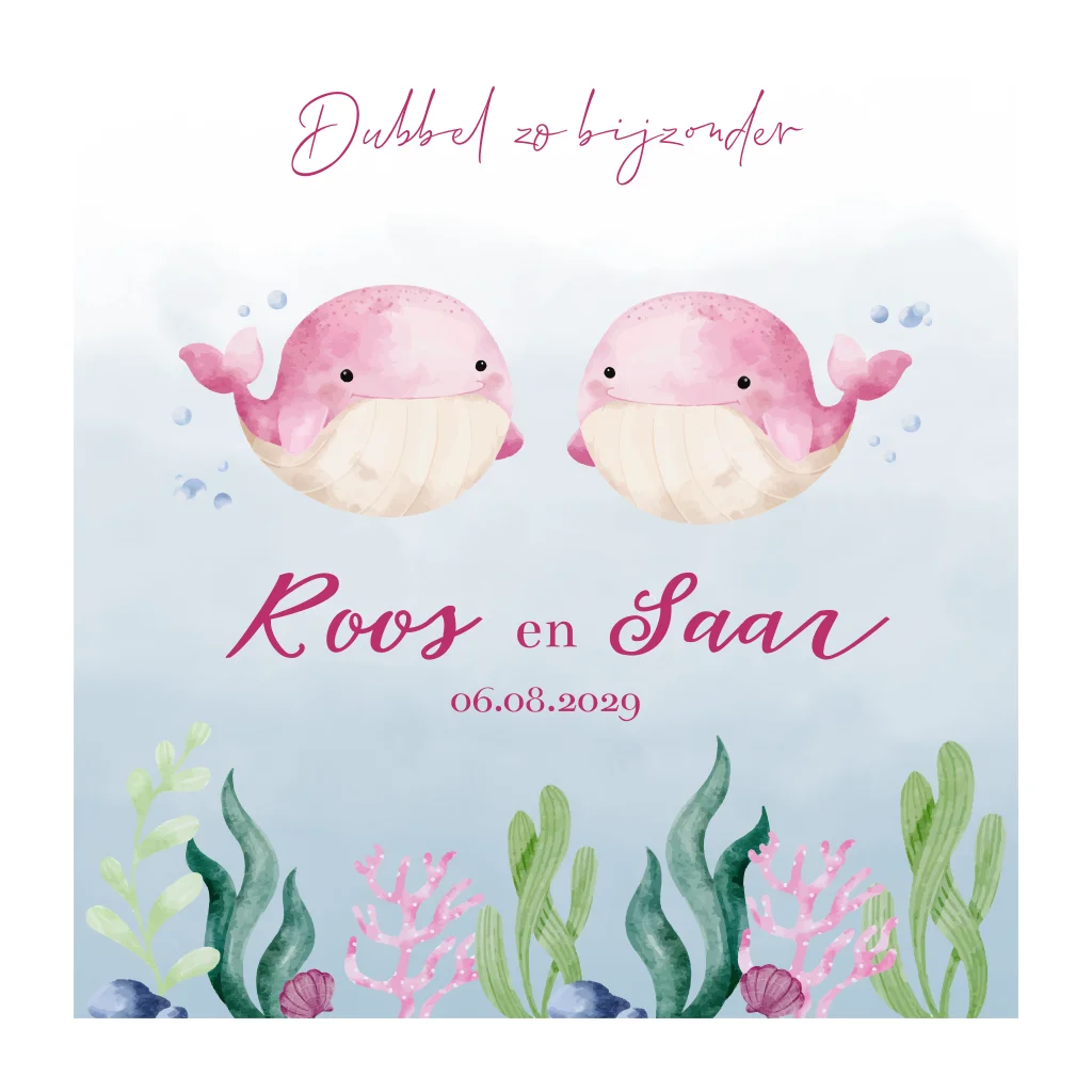 Dit geboortekaartje is een erg leuke keuze voor ouders die op zoek zijn naar een stoer maar lief geboortekaartje voor een tweeling. De kaart heeft een lichtblauwe achtergrond met een wit kader. In het midden van het kaartje zie je twee lieve roze walvissen in waterverf stijl met daaronder verschillende waterplanten.