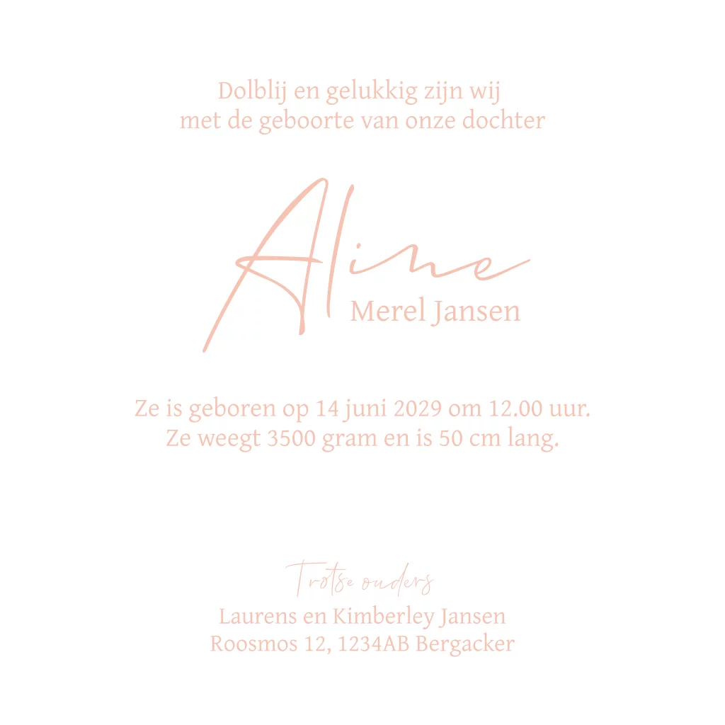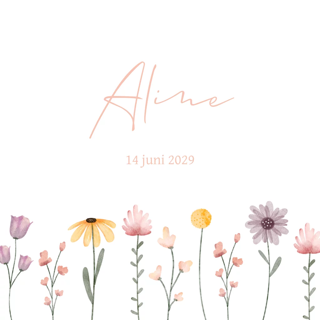 Een lief geboortekaartje met verschillende veldbloemen onderaan de kaart. Boven de bloementjes staat de naam en de geboortedatum.