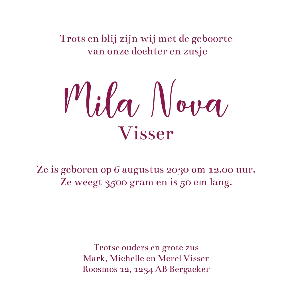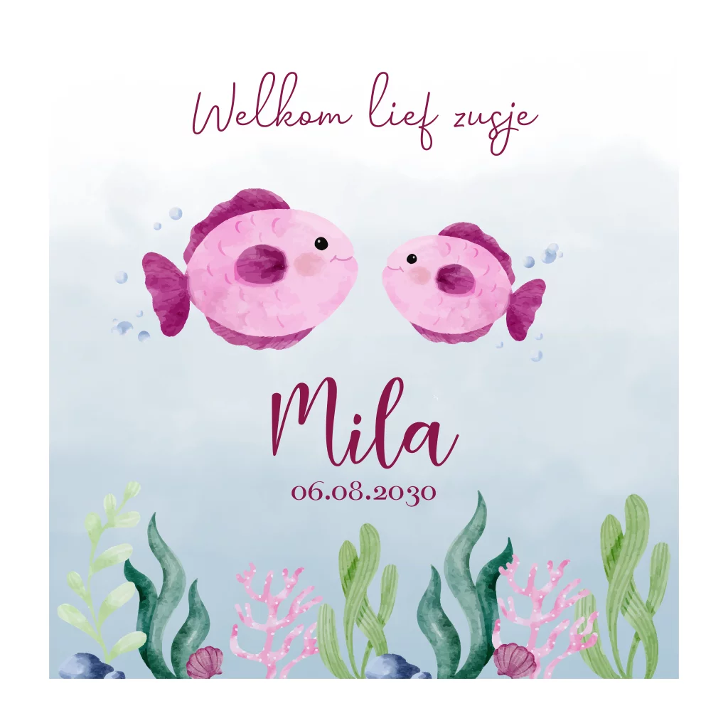 Een vrolijk geboortekaartje voor de geboorte van een zusje. Twee lieve roze visjes staan op de voorzijde van het geboortekaartje. Onder de visjes zie je verschillende waterplanten en schelpjes.