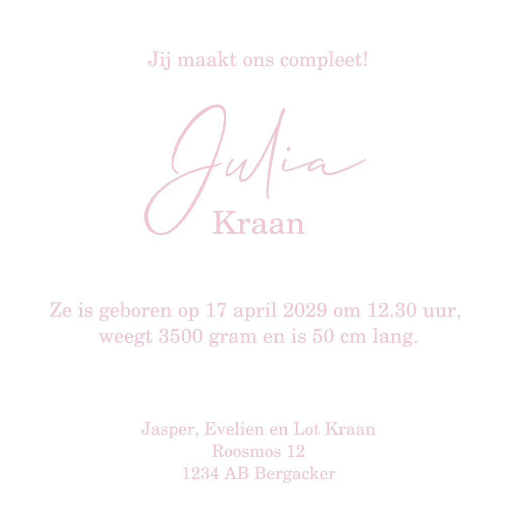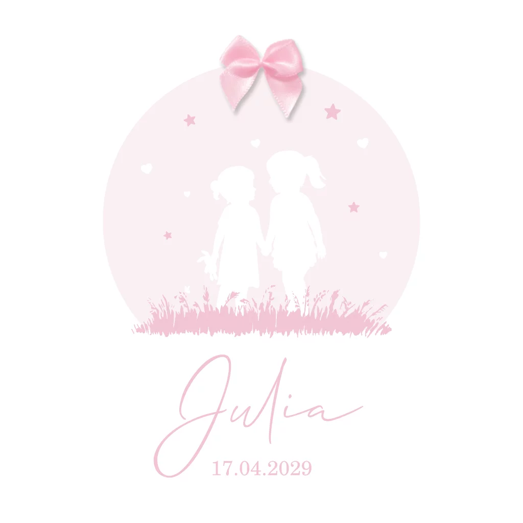 Een schattig lief roze kaartje met twee kleine meisjes die naar elkaar kijken in het gras, afgebeeld als silhouet. Om de kleintjes heen dwarrelen hartjes en sterren in het rond. Bovenaan de roze cirkel kan je een bijpassend strikje plaatsen om het helemaal compleet te maken. Tijdens het bestellen van de kaart kan je de strikjes er los bij bestellen.