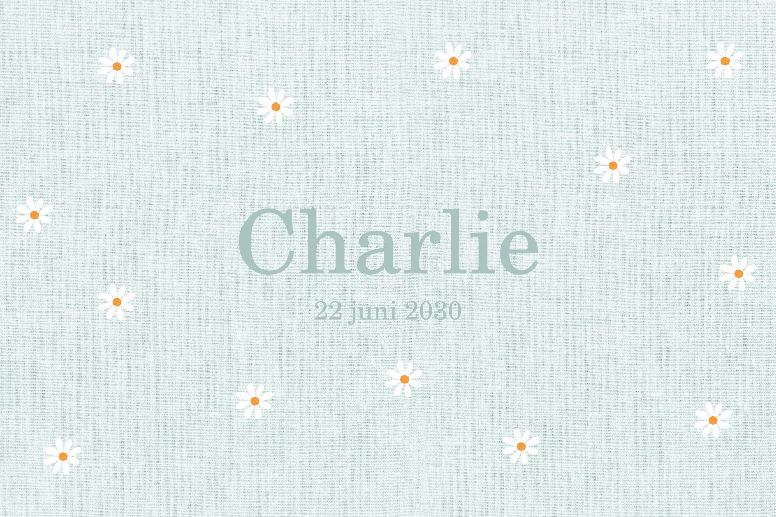 Een mint groen enkel geboortekaartje met speelse madeliefjes op de voorkant. Op de achterkant staan de geboortegegevens uitgebeeld met een icoon.