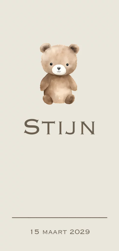 Enkel geboortekaartje in een zachte beige tint, met een lief beertje in een waterverf stijl op de voorzijde. Het schattige beertje op het geboortekaartje geeft een rustige en liefdevolle uitstraling. Dit geboortekaartje is geschikt voor zowel jongens als meisjes