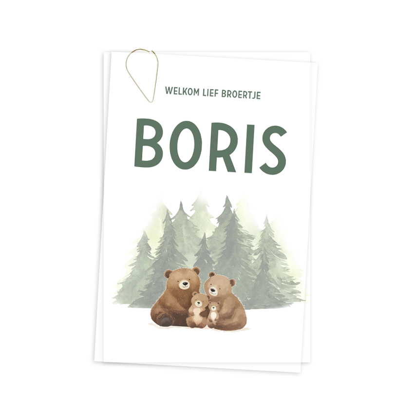 In verwachting van jullie tweede kleintje? Dan past deze beren familie goed bij jullie! Deze beren ouders hebben twee kleintjes en zitten voor de bomen van het bos. De naam van de baby en de berenfamilie staan afgedrukt op het kalkpapier velletje. Op de kaart zelf staan de bomen en aan de andere kant is er plek voor alle tekst passend bij de geboorte aankondiging.