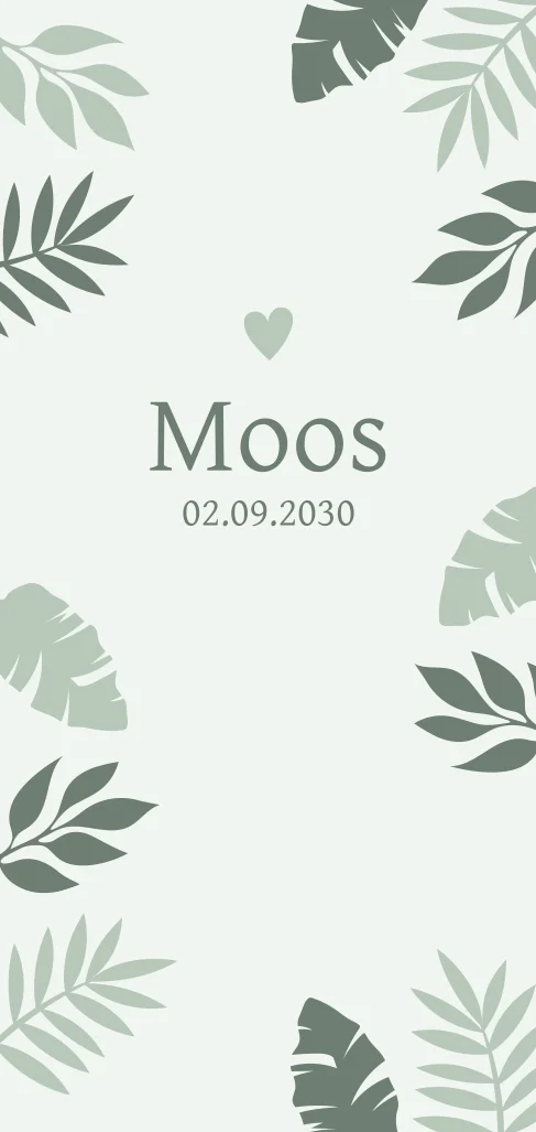 Een hip botanisch geboortekaartje voor de geboorte van jouw kindje. De kaart heeft een lichtgroene achtergrond kleur. Aan de rand van de kaart staan verschillende blaadjes in verschillende groen tinten. Boven de naam van de baby staat een klein hartje.