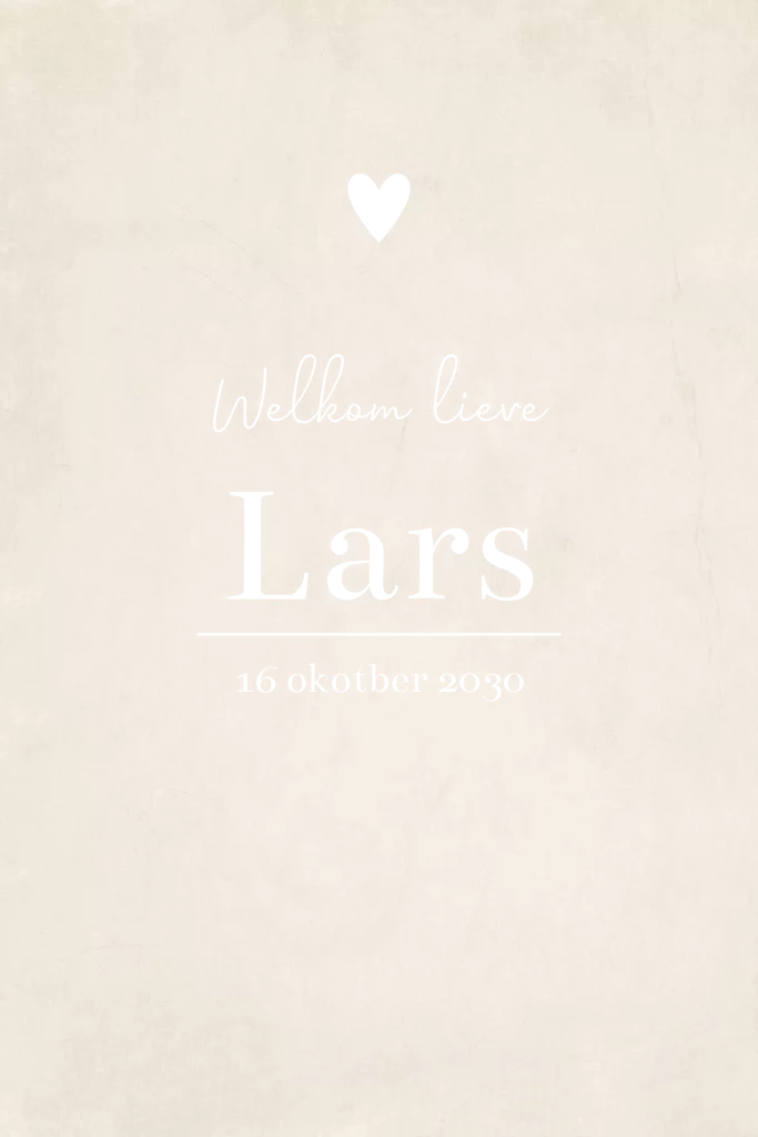 Een mooi beige geboortekaartje met op de voorzijde foliedruk. De kleur foliedruk is nog aan te passen in de editor. De voorbeeldnaam Lars staat in het midden met daaronder de geboortedatum en bovenaan de kaart staat een hartje. In de editor kan je deze bijvoorbeeld ook vervangen door een sterretje. Het kaartje is zo helemaal naar je eigen wensen aan te passen.