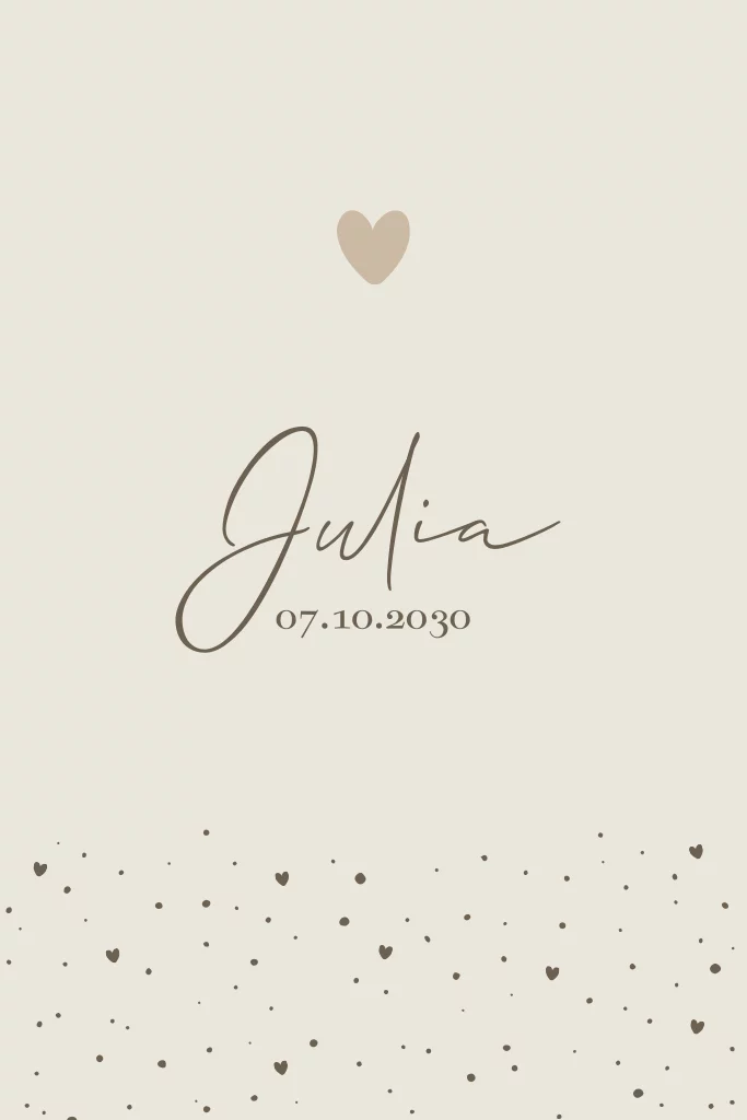 Een mooi strak enkel geboortekaartje met ronde hoeken en een neutrale achtergrond kleur. Op de voorzijde staat een klein hartje met daaronder de naam van de baby in een sierlijk lettertype. Het lettertype is nog te wijzigen in de editor. Dit beige geboortekaartje past helemaal bij de trend van nu.