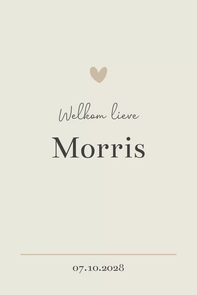 Een mooi strak enkel geboortekaartje met een neutrale achtergrond kleur. Op de voorzijde staat een klein hartje met daaronder de naam van de baby. Onderaan de kaart staat de geboortedatum.