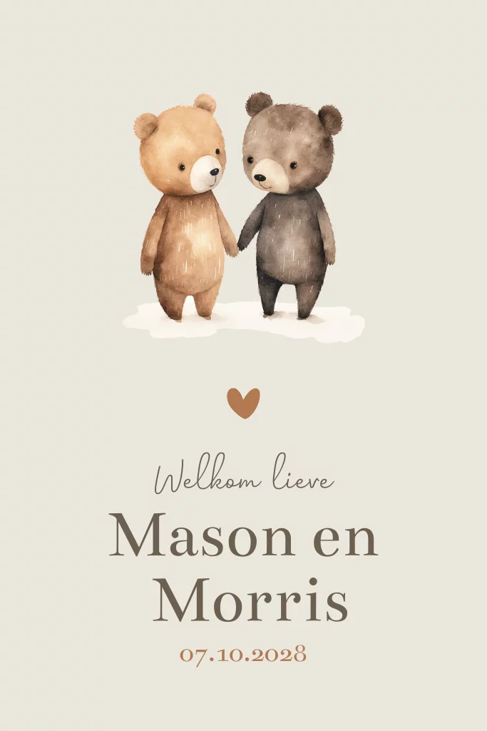 Een mooi enkel geboortekaartje met een beige achtergrond kleur. De neutrale achtergrondkleur zorgt ervoor dat dit kaartje geschikt is voor zowel jongens als meisjes. Op de voorzijde staan twee schattige kleine beertjes. Een lief geboortekaartje voor een tweeling.
