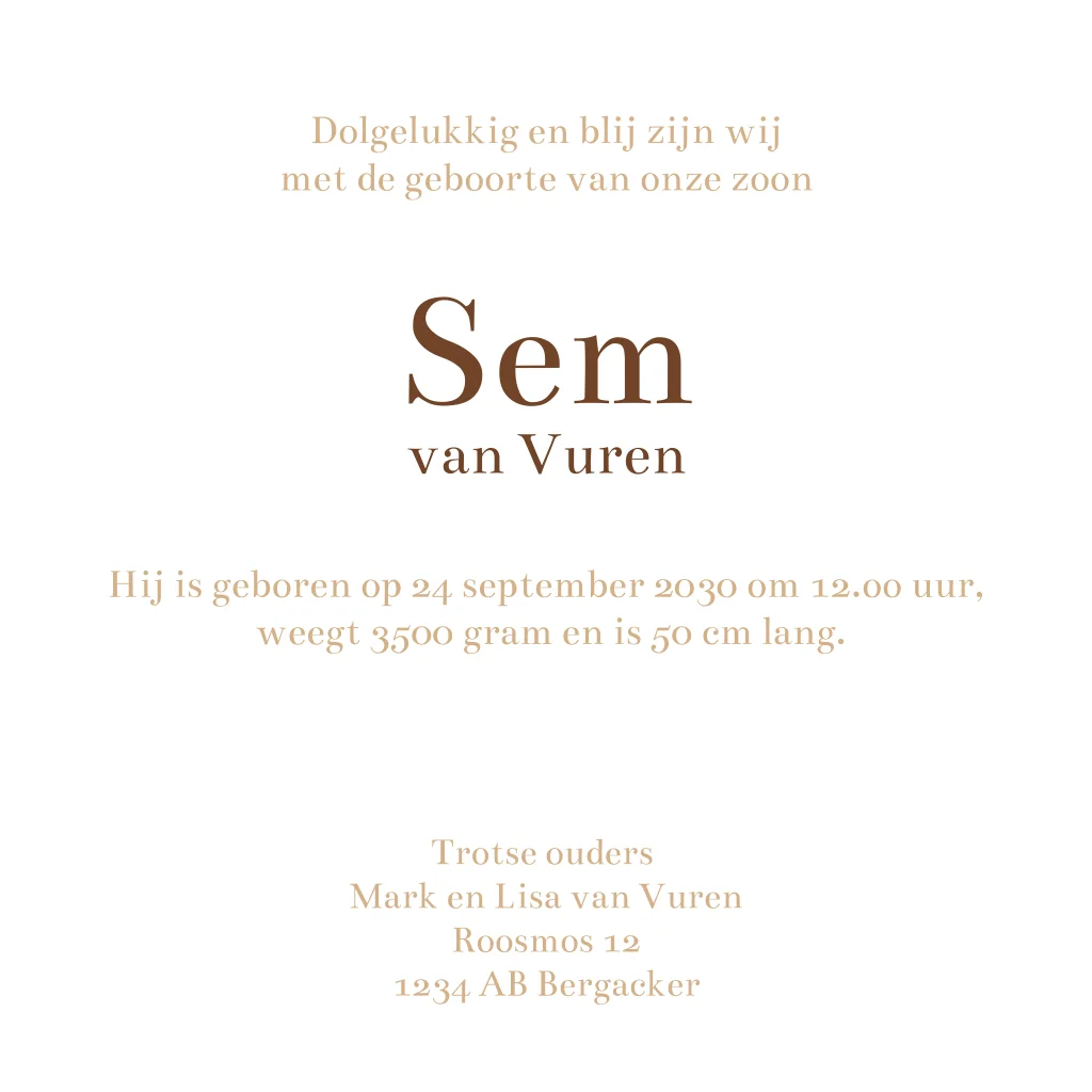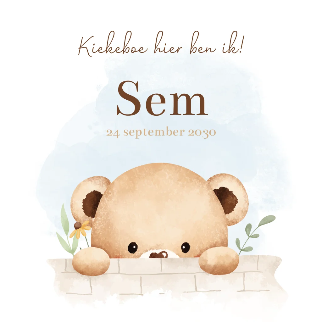Een lief geboortekaartje met een beertje verstopt achter een muur. Bovenaan de kaart staat Kiekeboe hier ben ik! Een vrolijke tekst om jouw kleintje mee aan te kondigen.