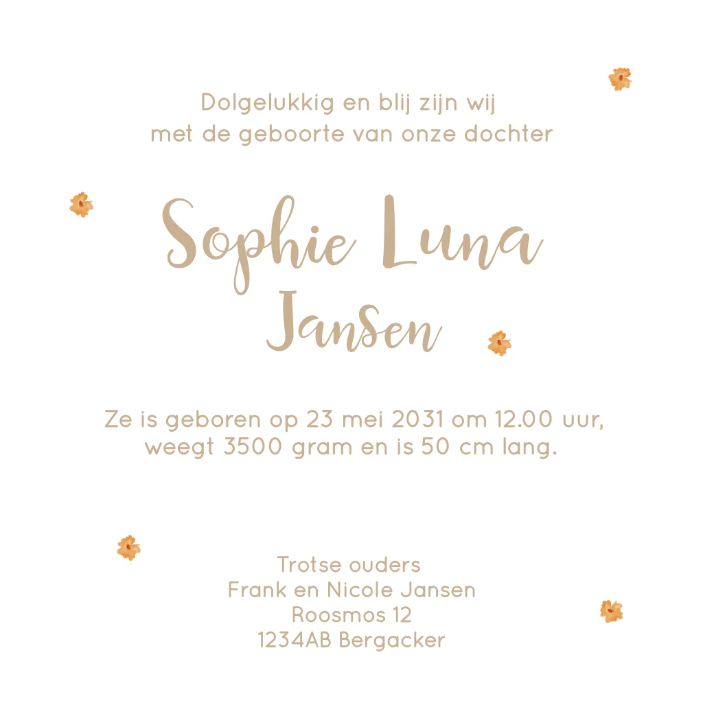 De voorbeeldnaam Sophie wordt weergegeven in een sierlijk handgeschreven lettertype, met daaronder de geboortedatum. De lettertypes zijn in de editor nog aan te passen. Dit geboortekaartje is ideaal voor ouders die houden van een lenteachtig, neutraal en natuur geïnspireerd ontwerp. Perfect als je op zoek bent naar een lief, minimalistisch geboortekaartje met een zachte en verfijnde uitstraling.