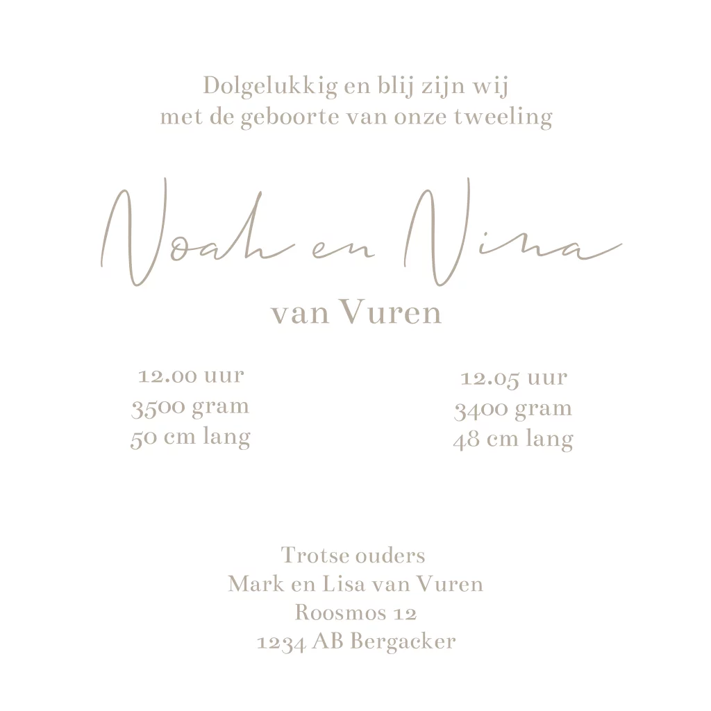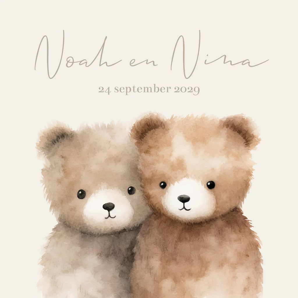Dit prachtige, neutrale geboortekaartje is perfect voor de aankondiging van de geboorte van een tweeling. Op de voorzijde van het kaartje staan twee schattige beertjes, met daarboven de namen van de kindjes. De zachte kleuren en het lieve ontwerp maken dit kaartje perfect voor zowel jongens als meisjes.