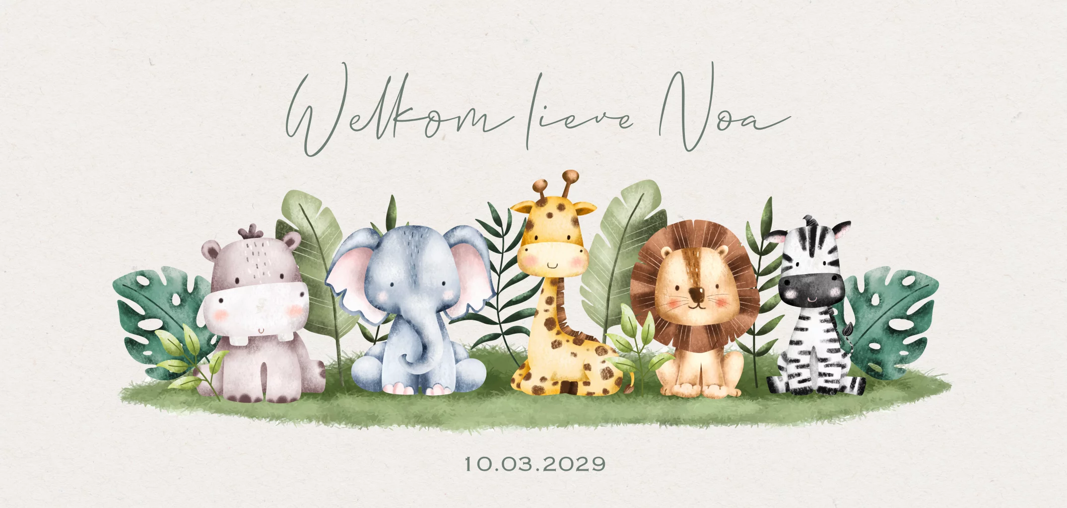 Een stoer geboortekaartje met lieve diertjes zoals een leeuw, giraf, zebra, nijlpaard en olifant op de voorzijde. Op de achterzijde staan nog mooie jungle bladeren.
