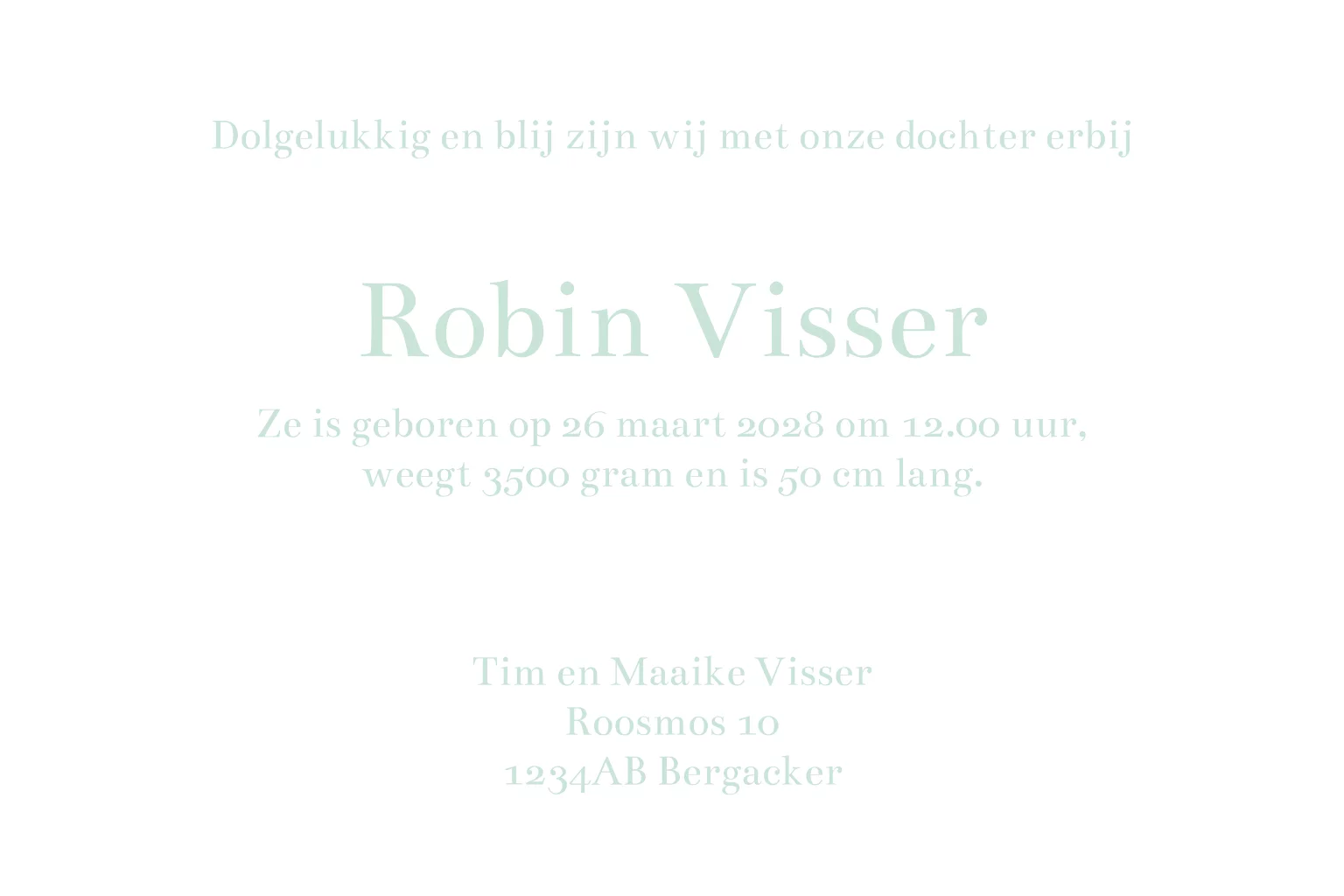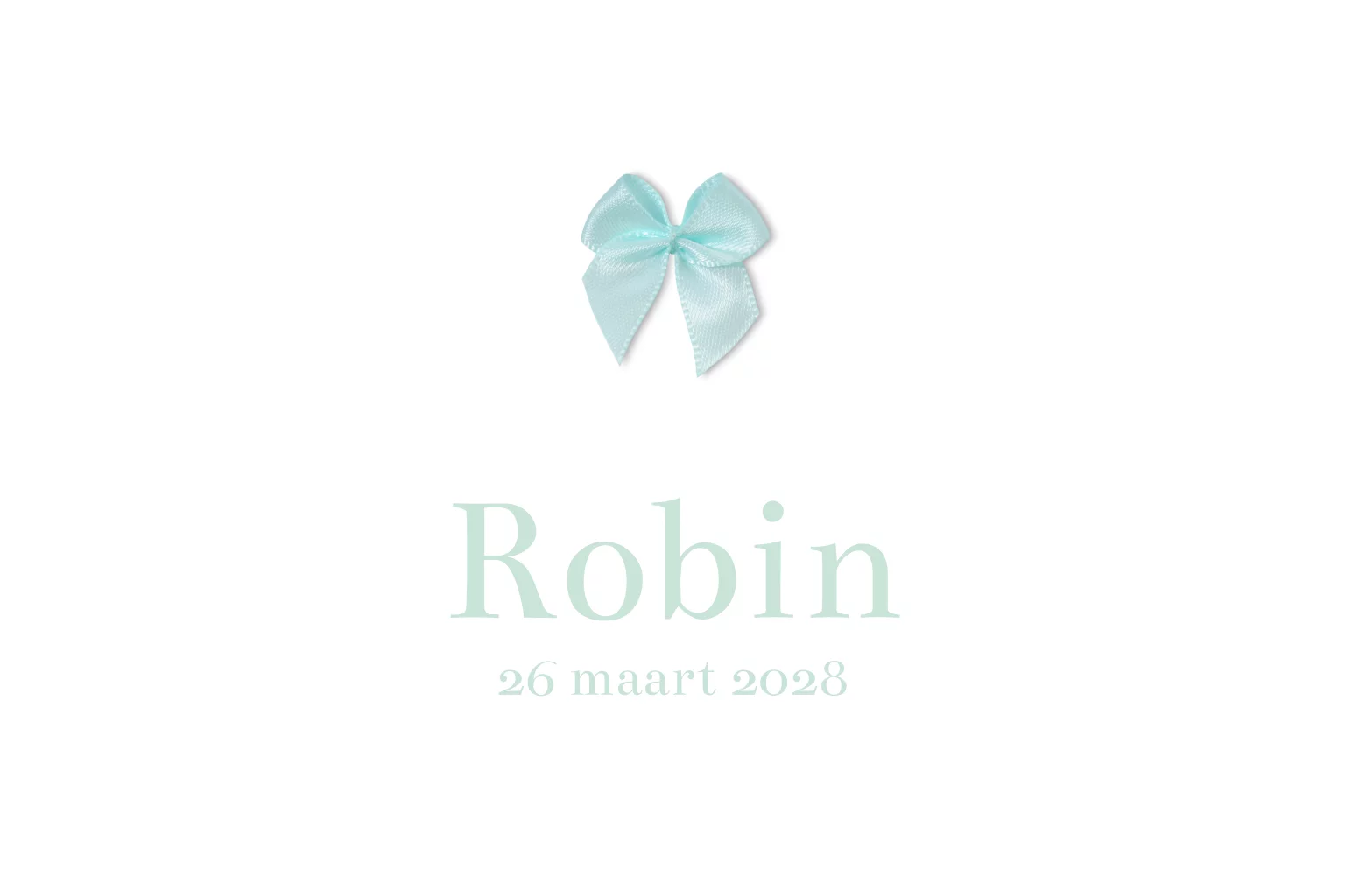 Een mooi klassiek geboortekaartje met op de voorzijde de naam van de baby en daarboven ruimte om een strikje te plakken. Er is keuze uit verschillende kleuren strikjes en deze zijn apart bij de kaartjes te bestellen.