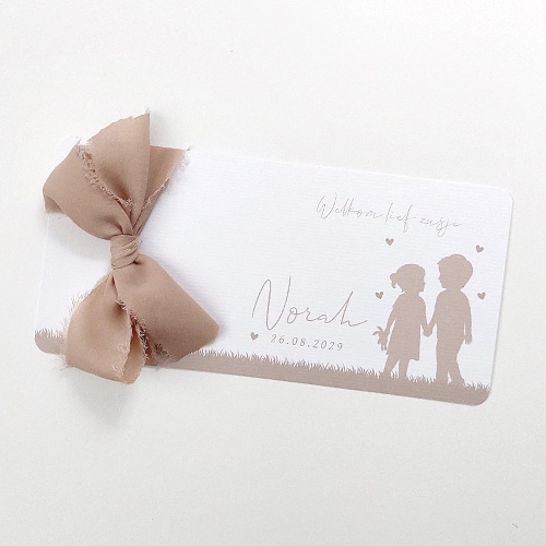 Een mooi klassiek geboortekaartje met op de voorzijde een beige silhouet van een grote broer met een klein zusje. Aan de linkerkant van de kaart is er ruimte om een strik te maken van beige chiffon lint die je apart bij de kaart kan bestellen. De mooie strik maakt dit kaartje helemaal af en uniek.