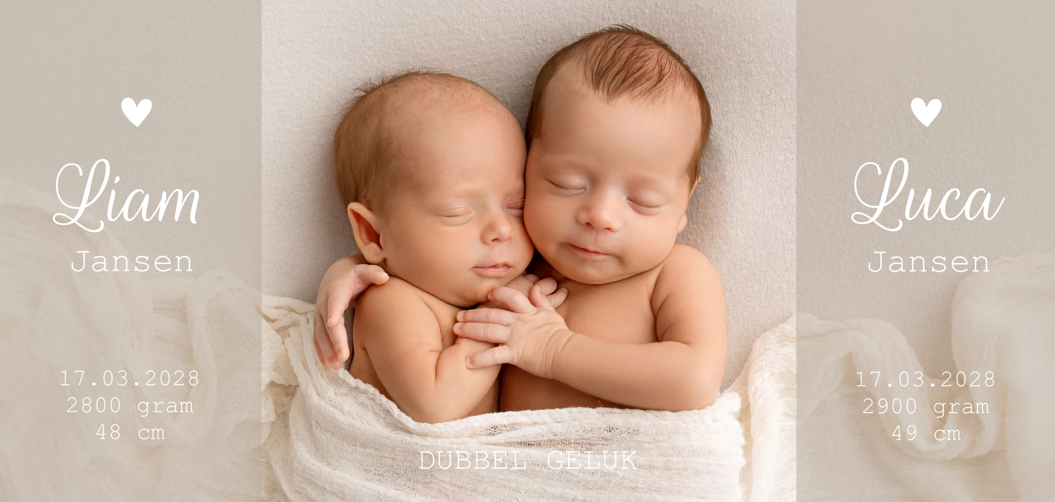 Een mooi strak geboortekaartje met op de voorzijde ruimte voor een foto van de kleintjes. Aan beide zijdes van de foto is er ruimte voor de namen en de geboortegegevens. De kleur foliedruk is ook nog te wijzigen in de editor.
