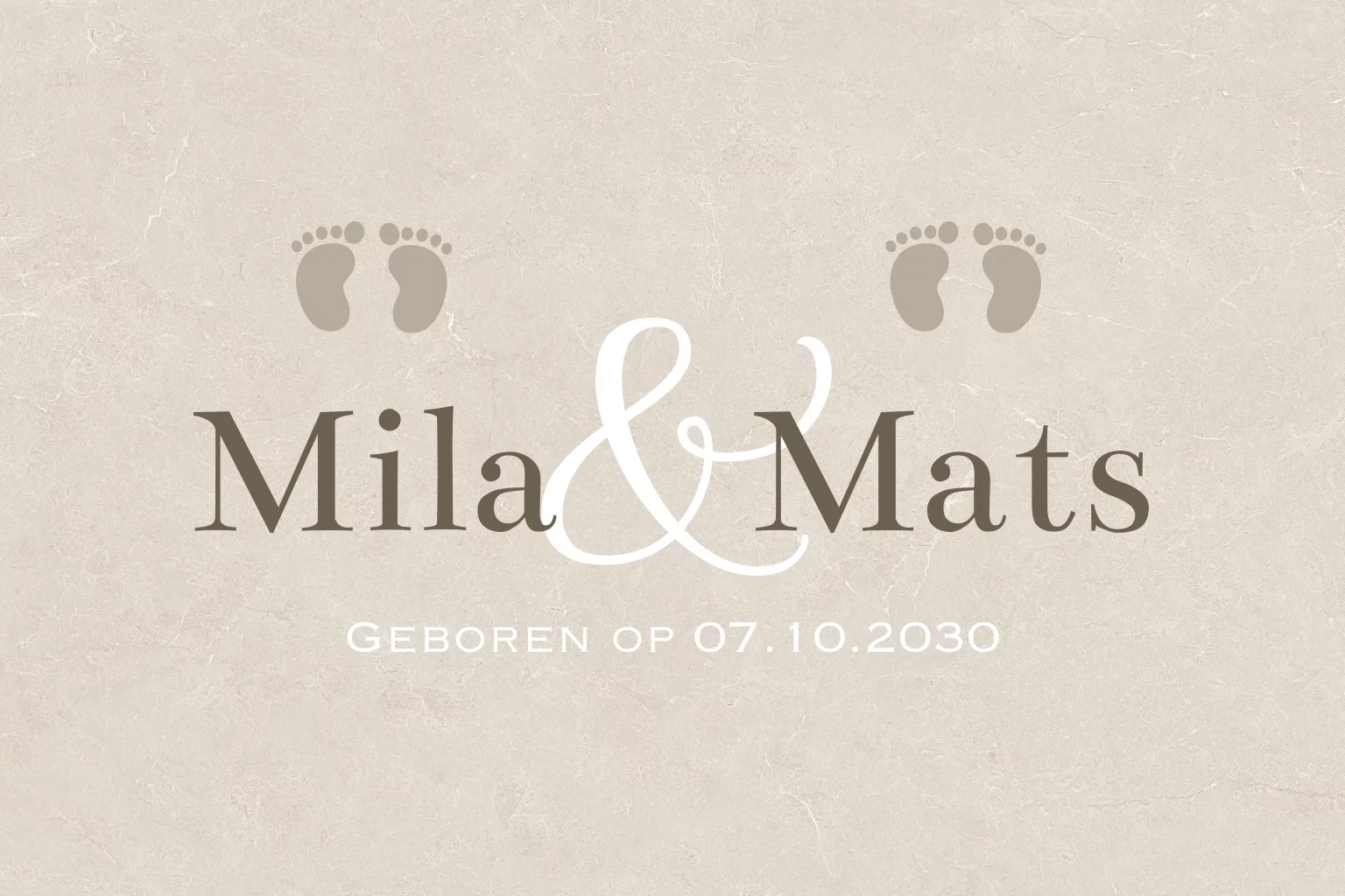 Een enkel geboortekaartje met een beige marmer achtergrond voor een tweeling. Boven de voorbeeldnamen Mila en Mats staan kleine babyvoetjes. Een lief neutraal geboortekaartje die erg leuk is voor de geboorte van een tweeling.