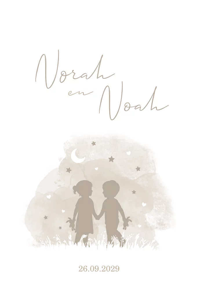 Een lief geboortekaartje in de vorm van een ronde boog voor een tweeling. Op de voorzijde zie je beige waterverf met daarin silhouetten van een meisje en een jongen die in het gras staan. Om de kindjes heen staan kleine hartjes en sterren.