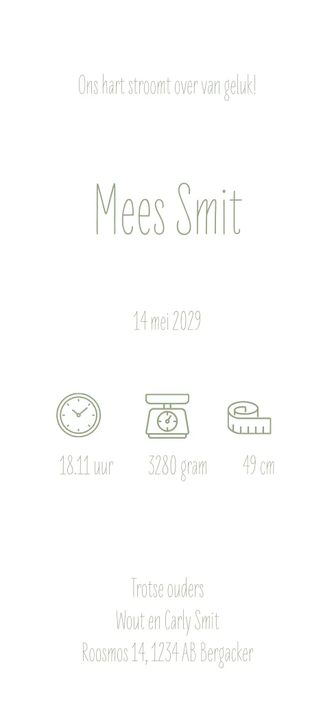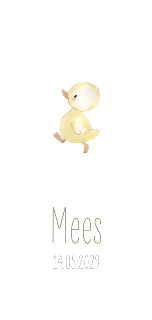 Staande witte dubbele kaart met een schattig klein getekend eendje op de voor- en binnenkant met grijs groen gekleurde tekst.