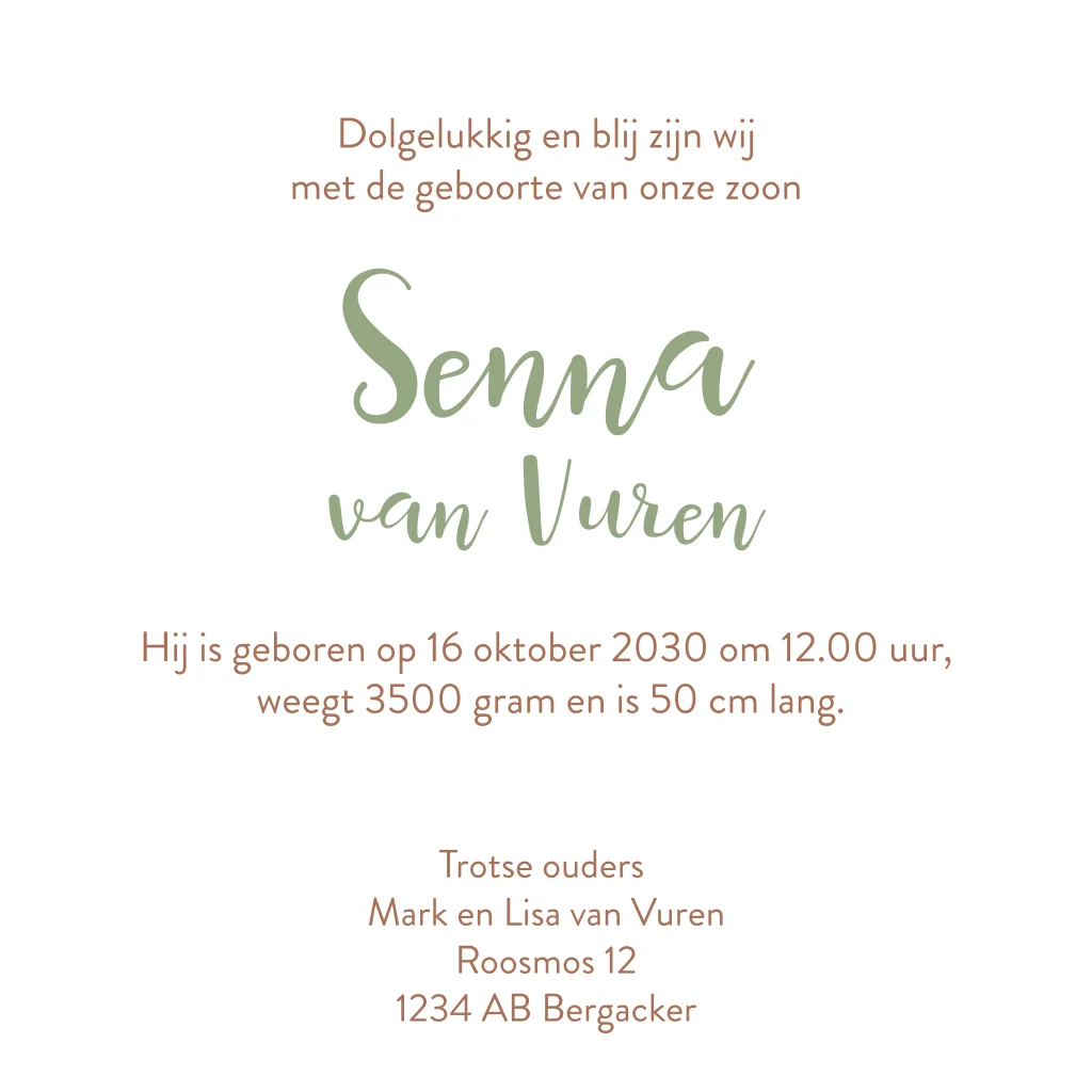 Een lief geboortekaartje met een eekhoorntje die op een boomstam zit en met een eikeltje tussen de pootjes. Het eekhoorntje zit tussen de groene blaadjes en paddestoelen. Op de achtergrond zie je groene waterverf. Een lief geboortekaartje voor een jongen of meisje die in de herfst geboren word.