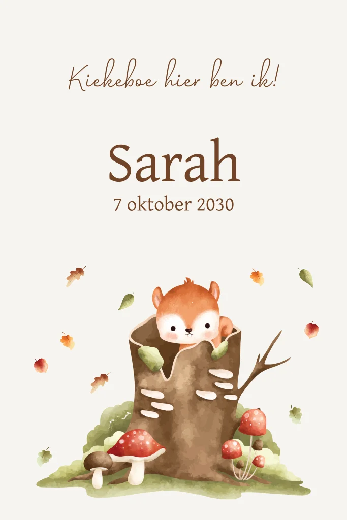 Een heel leuk geboortekaartje voor een jongen of meisje die in de herfstperiode geboren word. Een klein eekhoorntje komt uit de boomstam naar boven. Bovenaan de kaar staat ook de tekst Kiekeboe hier ben ik!. Om de boomstam heen zie je de herfstblaadjes vallen. Ook staan er nog kleine paddestoelen naast de boomstam in het groen.