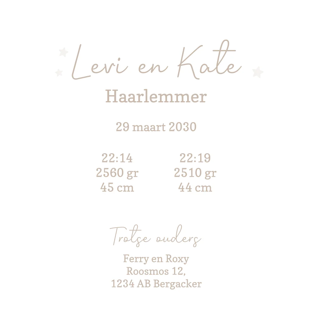 Op dit witte geboortekaartje staan een tweeling afgebeeld in het wit met twee knuffeltjes in de hand tussen de sterren, hartjes, vlinder en maan in een beige gekleurde cirkel.