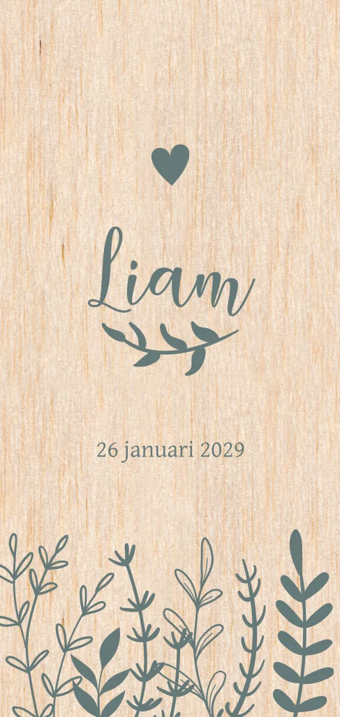 Een geboortekaartje gemaakt van echt hout. Op de voorzijde staan onderin verschillende takjes met blaadjes. Onder de naam van de baby staat ook een takje met boven de naam een hartje. De groene kleur is nog aan te passen naar elke andere kleur via de editor.