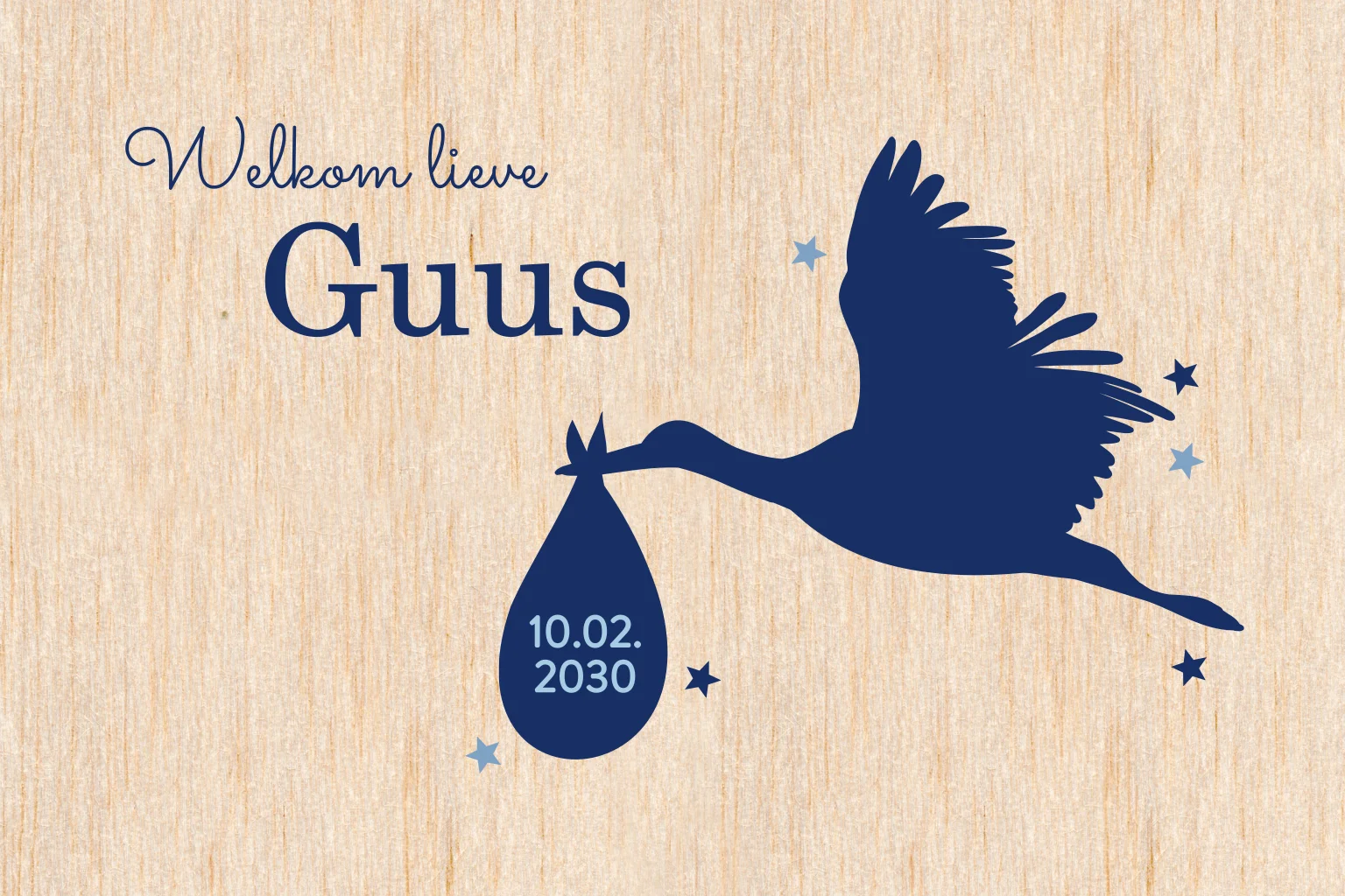 Een heel bijzonder geboortekaartje gemaakt van echt hout. Het is een enkel geboortekaartje met ronde hoeken. Op de voorzijde staat een donkerblauwe ooievaar met aan zijn bek een zakje met daarop de geboortedatum. Naast de ooievaar staat de voorbeeldnaam Guus.