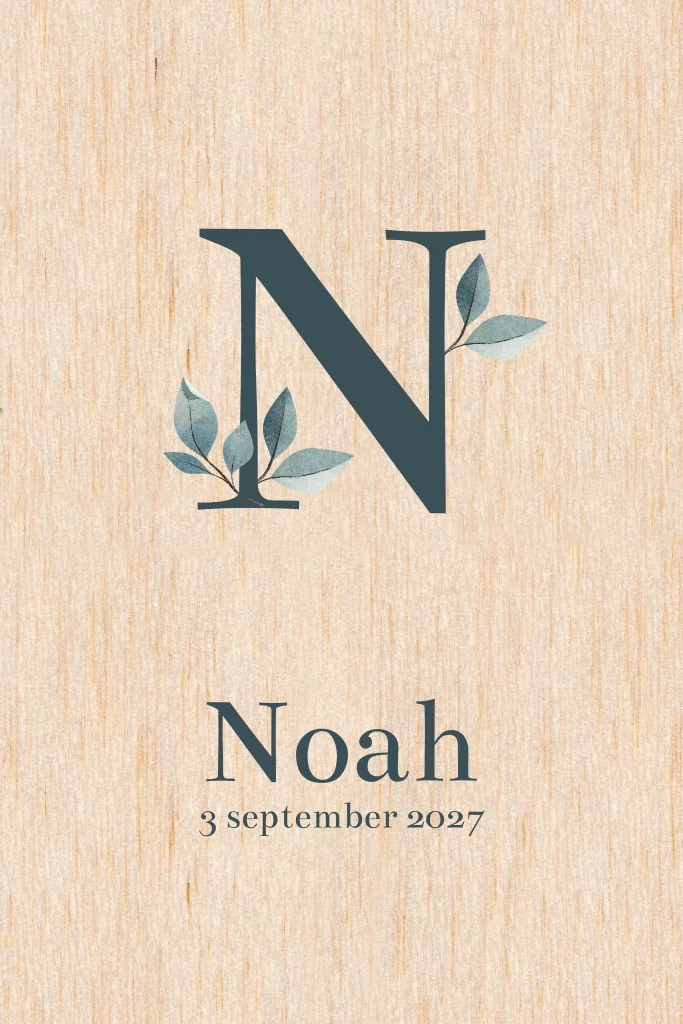Een hip geboortekaartje gedrukt op echt hout. Op de voorzijde staat groot de voorletter van de naam van de baby. De blaadjes zijn te verplaatsen zodat er bij elke voorletter een mooi ontwerp gemaakt kan worden in de editor.