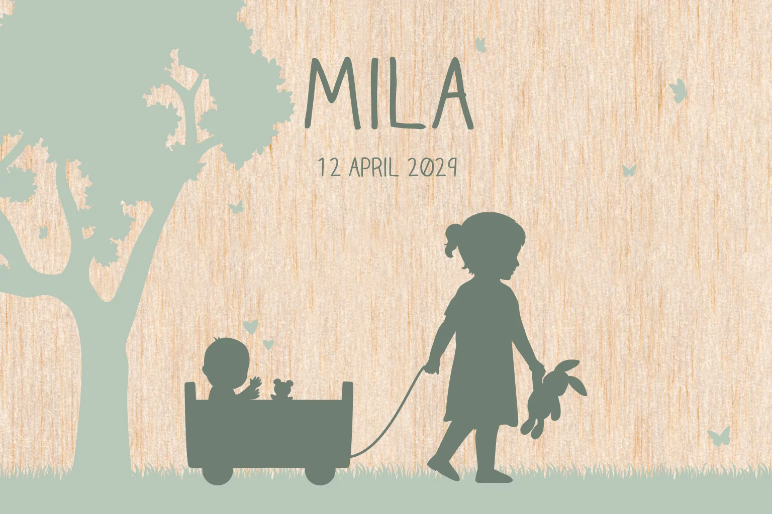 Ontdek ons lief houten kaartje met een teder silhouet van een grote broer die zijn nieuwe broertje of zusje trekt in een kar over het gras. Dit illustratieve kaartje is opgemaakt met twee groentinten, wat zorgt voor een warm en natuurlijk gevoel.