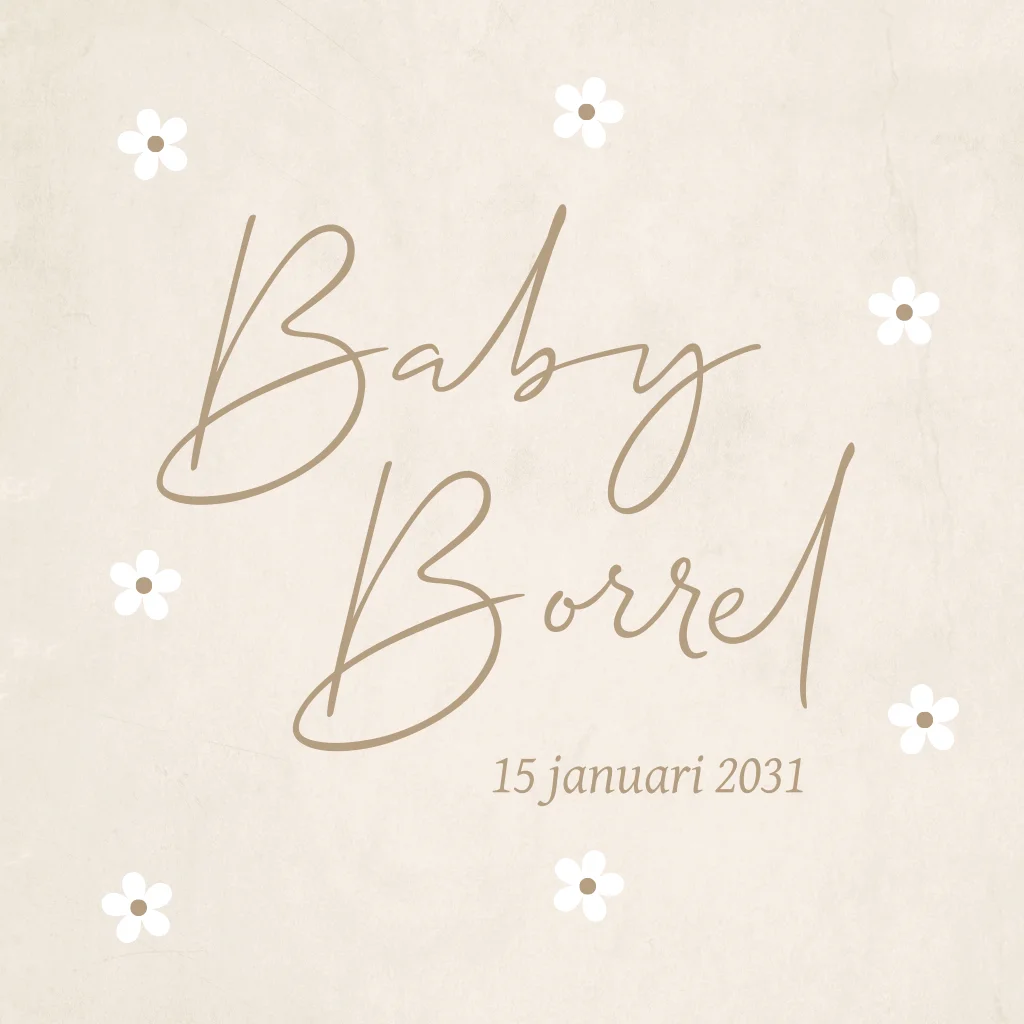 Een mooi beige kleurige babyborrel uitnodiging met witte bloemen. In het midden staat de tekst in een sierijk lettertype met daaronder de datum van de babyborrel. De lettertypes zijn nog te wijzigen in de editor. Een lief kaartje om toe te voegen aan het bijpassende geboortekaartje om zo het eerste feestje van jouw kleintje mee aan te kondigen.