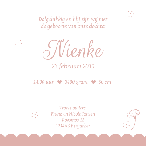 Het bestellen van geboortekaartjes is een speciale gelegenheid die ook spannend kan zijn. Je kan bij ons kiezen uit veel verschillende soorten geboortekaartjes voor een meisje in verschillende stijlen. Zo hebben wij uiteenlopende stijlen, van klassieke geboortekaartjes tot geboortekaartjes met veel kleur. Bij het kiezen van het perfecte kaartje zijn er verschillende dingen waar je rekening mee kan houden. Het is natuurlijk het belangrijkste dat je een geboortekaartje kiest dat het beste bij jullie smaak past en waar je een goed gevoel bij hebt. Je kan een geboortekaartje uitzoeken op een bepaalde kleur, met een diertje erop of een bepaald patroon. Een populaire keuze voor meisjes zijn vaak zachte pasteltinten zoals roze, lila of mintgroen, maar bij moderne trends zien wij ook vaak neutrale of zelfs wat felle contrasterende kleuren. Bloemmotieven, schattige dierenfiguren, of elegante typografie kunnen het kaartje een persoonlijke en unieke uitstraling geven. Het is ook mogelijk om een foto van je pasgeboren meisje op het geboortekaartje te plaatsen voor een extra persoonlijk tintje. Heb je een mooi meisjeskaartje gevonden? Dan kan je het geboortekaartje gemakkelijk in onze editor helemaal naar eigen wens aanpassen.