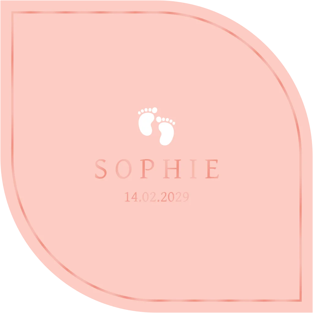 Geboortekaartje in blad vorm met subtiele kader lijn in roze kleur