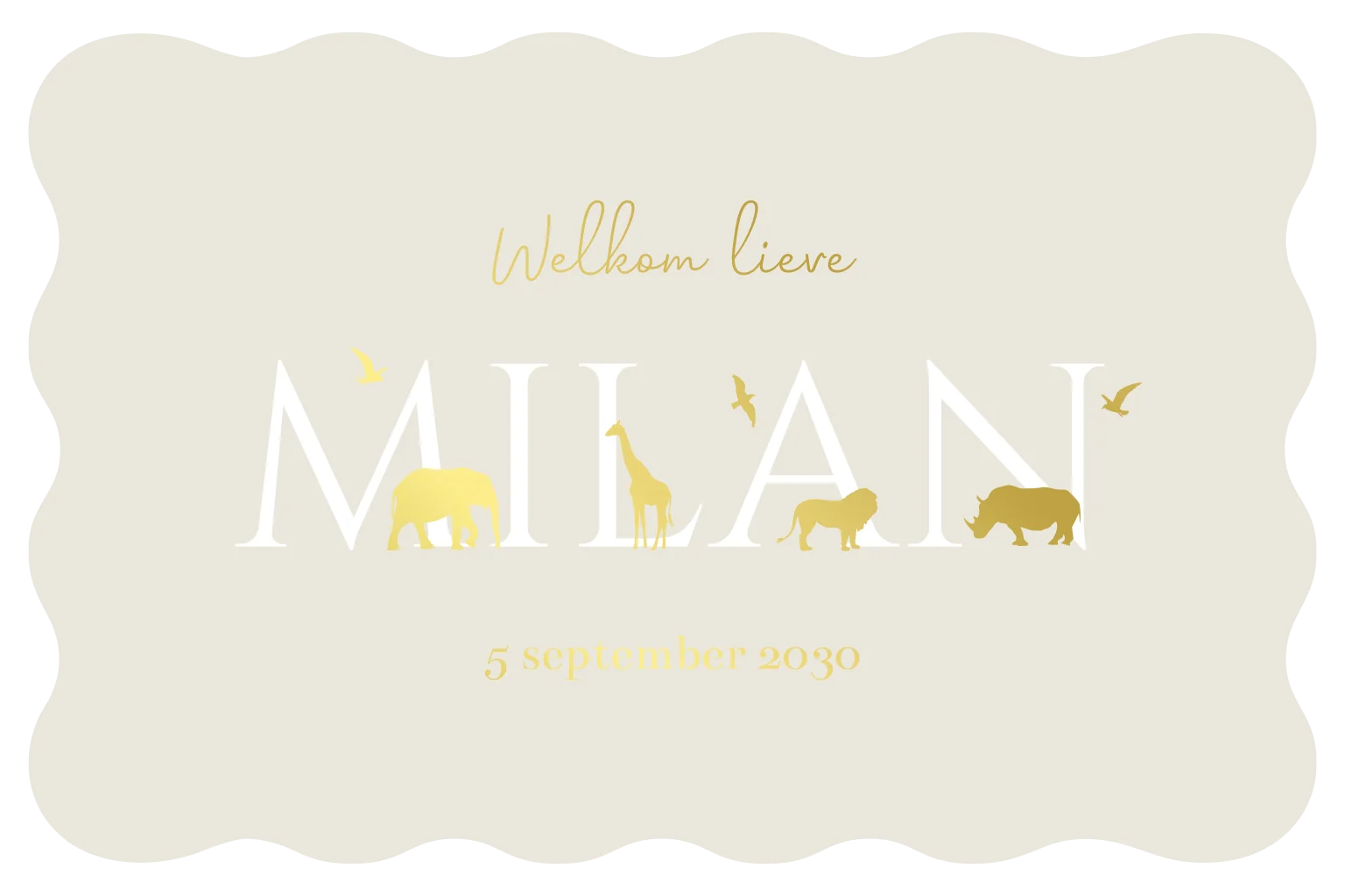 Een hip geboortekaartje met een golvende rand en een beige achtergrond kleur. De achtergrondkleur is in de editor nog aan te passen naar elke andere kleur. De naam van de baby staat in het wit met daarvoor in het klein safari dieren gedrukt in foliedruk. Je ziet een olifant, een giraf, een leeuw en een neushoorn. In de lucht zie je nog een aantal vogels. De dieren op het kaartje zijn in de editor ook nog te wijzigen naar andere dieren. Wij helpen je hier graag bij als dit niet wilt lukken.