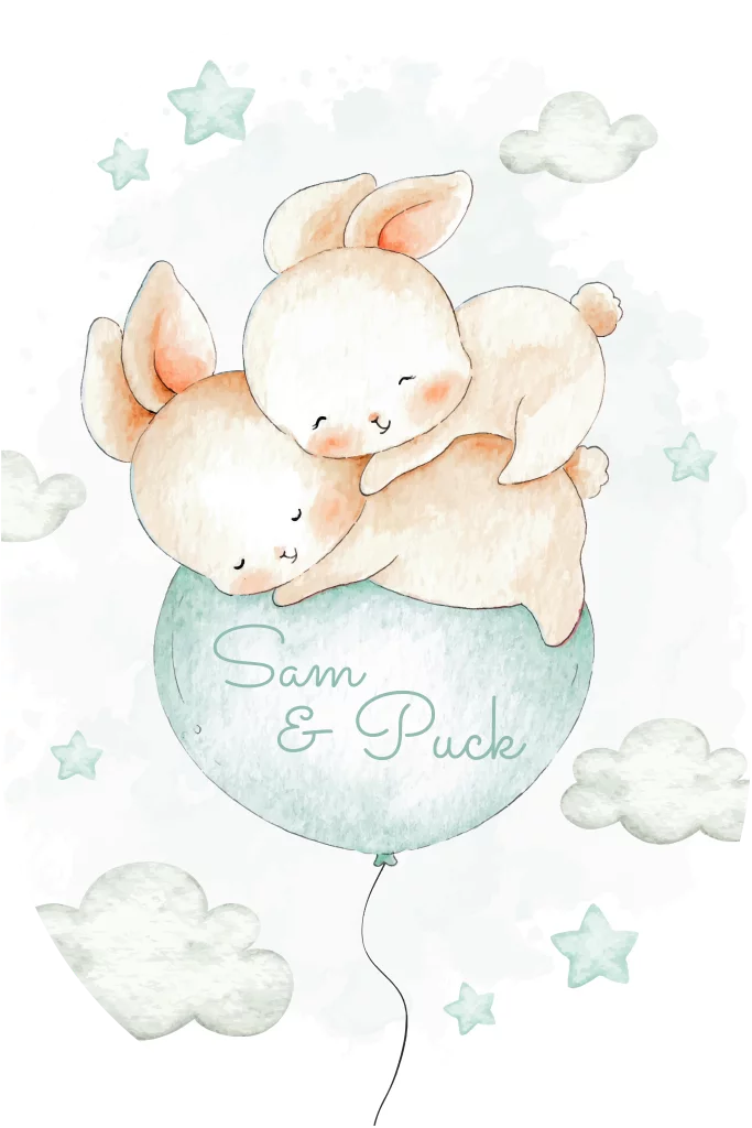 Een prachtige zacht groen gekleurd enkel kaartje in de vorm van een ovaal, met twee schattige konijntjes die tussen de sterren en wolken op een groen gekleurde ballon zweven. Dit kleurrijke en illustratieve ontwerp straalt vrolijkheid en liefde uit, perfect passend bij de komst van jullie kindje.
