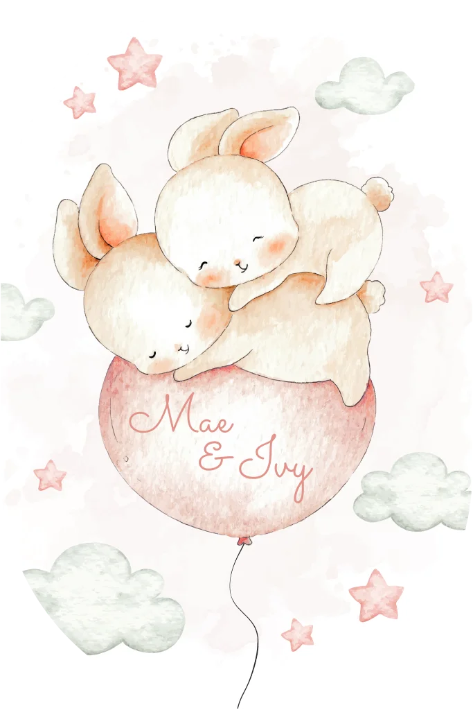 Een prachtige zacht roze gekleurd enkel kaartje in de vorm van een ovaal, met twee schattige konijntjes die tussen de sterren en wolken op een groen gekleurde ballon zweven. Dit kleurrijke en illustratieve ontwerp straalt vrolijkheid en liefde uit, perfect passend bij de komst van jullie kindje.