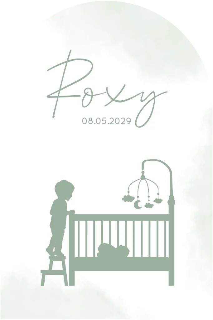 Dit prachtige geboortekaartje is perfect voor de aankondiging van de komst van jullie dochter. Het toont een teder tafereel van een grote broer die nieuwsgierig over de rand van de wieg gluurt naar zijn slapende zusje, omringd door zachte waterverf die de kaart een extra sfeervolle uitstraling geeft. Het unieke ontwerp is aanpasbaar in de editor, waardoor je eenvoudig de grote broer kunt vervangen door een grote zus. Bovendien zijn de kleuren volledig naar wens aan te passen, zodat het geboortekaartje perfect aansluit bij jullie eigen stijl en voorkeuren.