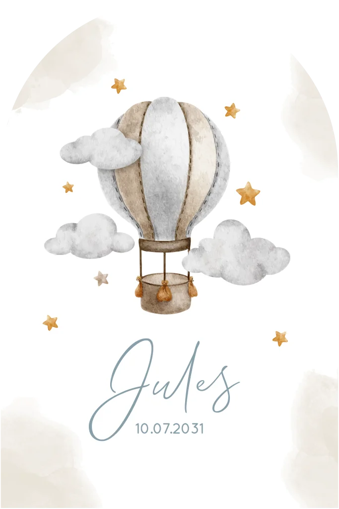 Een dromerig geboortekaartje met een beige grijze luchtballon en sterren. Het geboortekaartje heeft een bijzondere vorm met een ronde boog aan de bovenkant. Het is een enkel geboortekaartje met aan de zijkanten van de kaart beige waterverf. De luchtballon vliegt tussen de wolken en sterren. Onder de luchtballon staat de voorbeeldnaam Jules in een sierlijk lettertype met daaronder de geboortedatum. In de editor is er keuze uit veel verschillende lettertypes.
