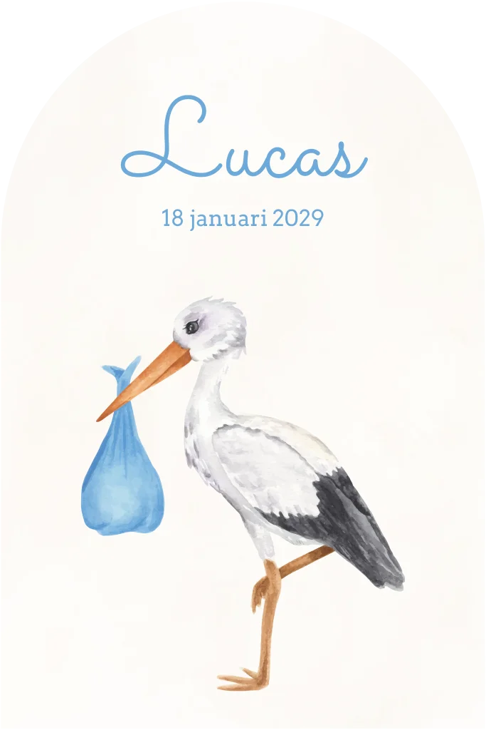 Geboortekaartje met ronde boog vorm en ooievaar blauw