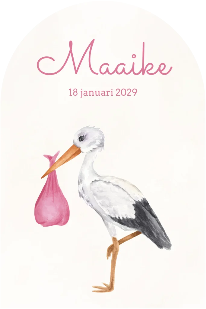 Geboortekaartje met ronde boog vorm en ooievaar roze