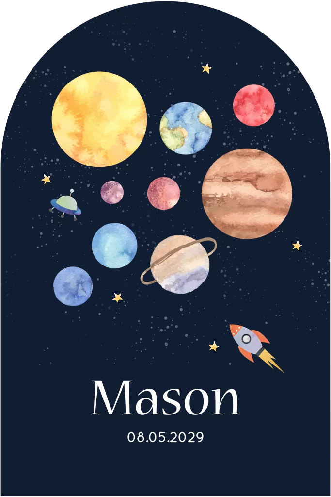 Een stoer enkel geboortekaartje in de vorm van een ronde boog. Op een donkerblauwe achtergrond met sterren zie je de planeten in waterverf stijl staan. De planeten zijn in verschillende kleuren te zien waardoor ze goed opvallen en het kaartje een vrolijke uitstraling krijgt.