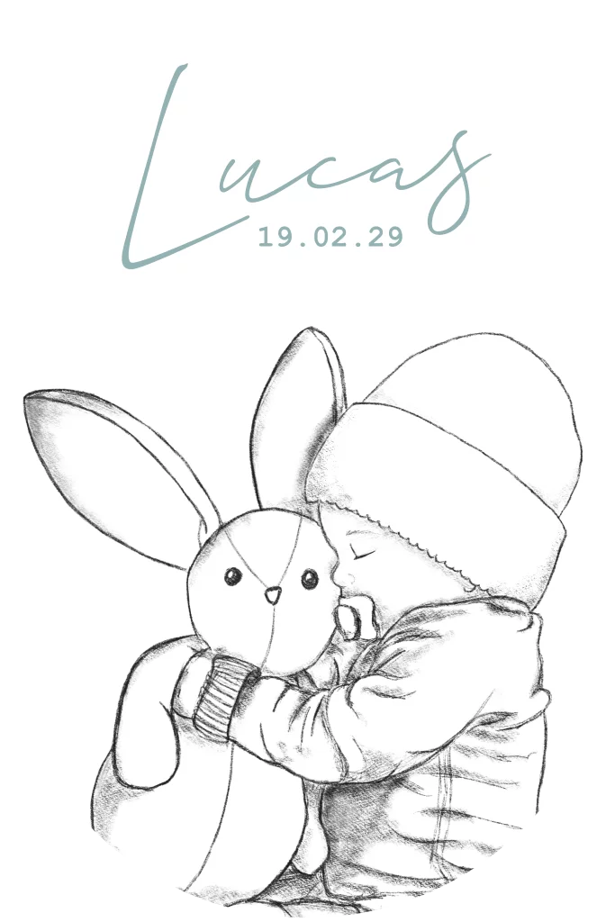 Ons "Geboortekaartje met tekening van een baby met knuffel" is een unieke en originele keuze om de komst van jullie kleintje aan te kondigen. De enkele ovaalvormige kaart is voorzien van een prachtige zwart-wit tekening in een charmante geschetste stijl. Op de tekening is een lieve slapende baby te zien, knuffelend met een knuffelkonijn. Deze kaart straalt tederheid en speelsheid uit, perfect passend bij de blijde gebeurtenis van een geboorte. De stans in de vorm van de ovaal voegt een extra vleugje charme toe aan het ontwerp, waardoor het een onvergetelijke indruk zal achterlaten bij jullie familie en vrienden. Dit geboortekaartje is een prachtige manier om jullie persoonlijkheid en blijdschap te uiten en tegelijkertijd een blijvende herinnering te creëren aan deze bijzondere gebeurtenis. Kies voor ons "Geboortekaartje met tekening van een baby met knuffel" en laat jullie boodschap van vreugde en liefde op een unieke en gedenkwaardige manier verspreiden. We kijken ernaar uit om jullie te helpen bij het creëren van een aandenken dat de start van jullie nieuwe avontuur op een prachtige manier weergeeft.