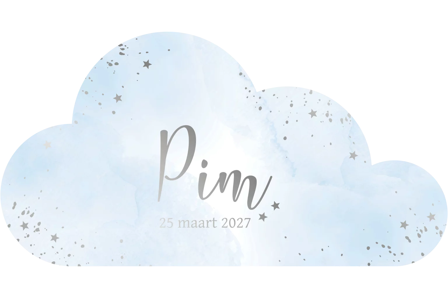 Een geboortekaartje in de vorm van een wolk met op beide zijdes foliedruk. De foliedrukkleur is te wijzigen in de editor. Op de achtergrond is blauwe waterverf te zien en kleine sterren.