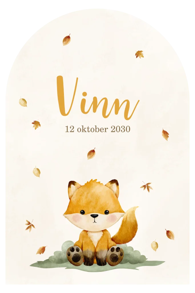Een hip geboortekaartje in de vorm van een ronde boog voor de geboorte van een jongen of meisje. Het is een enkel kaartje met aan de voorzijde een vosje aan de onderkant van de kaart. Boven het vosje zie je de herfstbladeren vallen. Tussen alle blaadjes in staat de voorbeeldnaam Vinn en daaronder de geboortedatum.