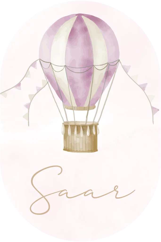 Met zijn zachte roze paars tinten en dromerige luchtballon straalt dit kaartje een vertederende sfeer uit. De ronde ovaal vorm benadrukt de ronding van de luchtballon en draagt bij aan de lieve uitstraling van het ontwerp.