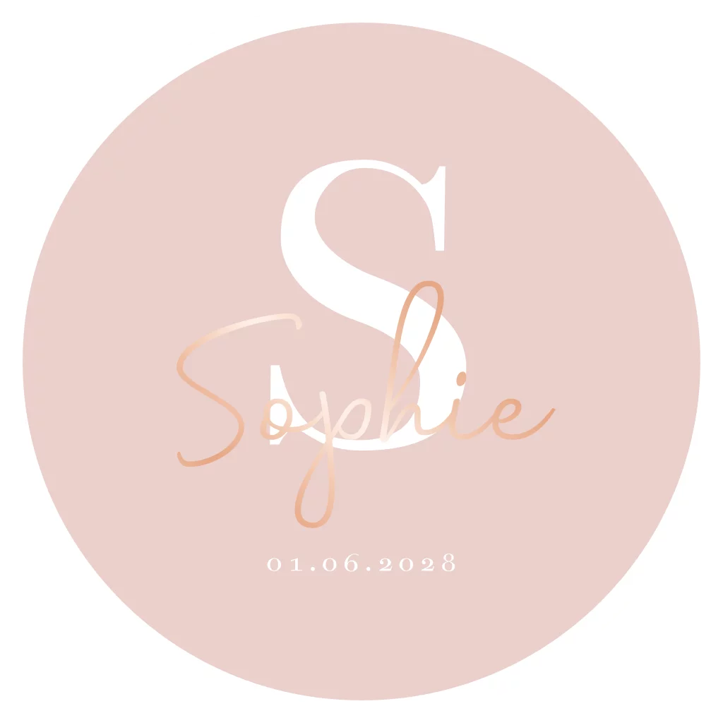 Rond geboortekaartje met voorletter en naam in foliedruk