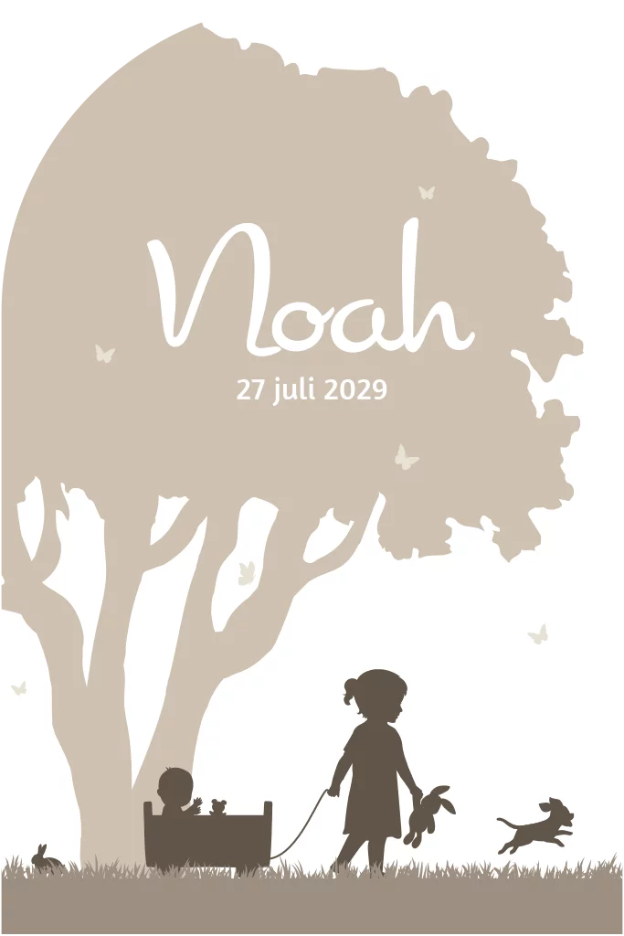 Ons prachtige taupe gekleurde enkele geboortekaart met een ronde boog bovenkant is een uniek en liefdevol ontwerp dat perfect is voor de aankondiging van jullie nieuwe gezinslid. Het kaartje toont een schattig tafereel van een kindje met een kar waar een baby in zit, vergezeld door een knuffeltje. Om hen heen dartelen een lief konijntje en een trouwe hond, terwijl vlinders vrolijk om de boom fladderen op de achtergrond. Dit originele geboortekaartje met een sfeervol silhouet in het gras is perfect voor de aankondiging van jullie tweede kindje.