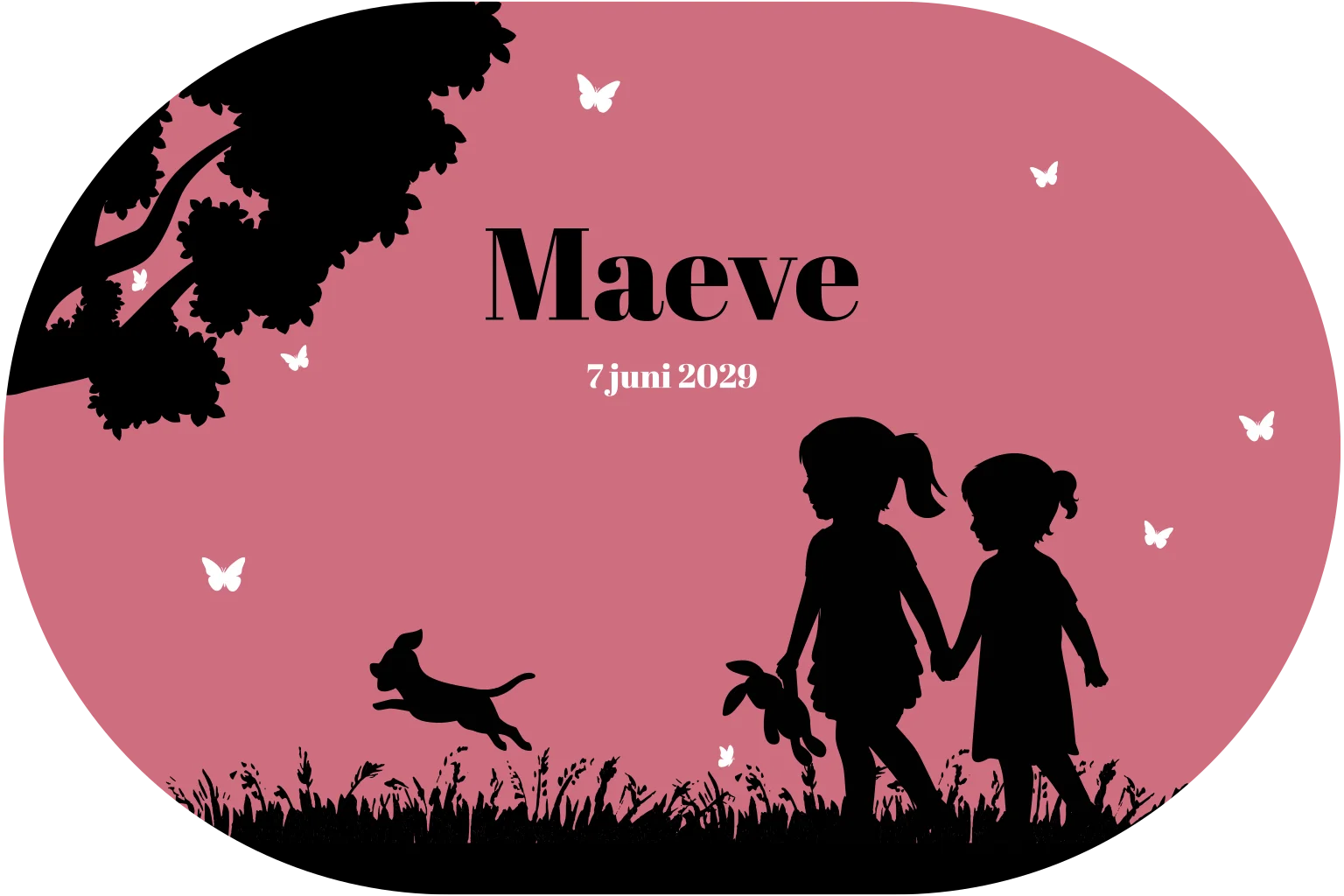 Silhouet geboortekaartje met twee zussen in het gras roze