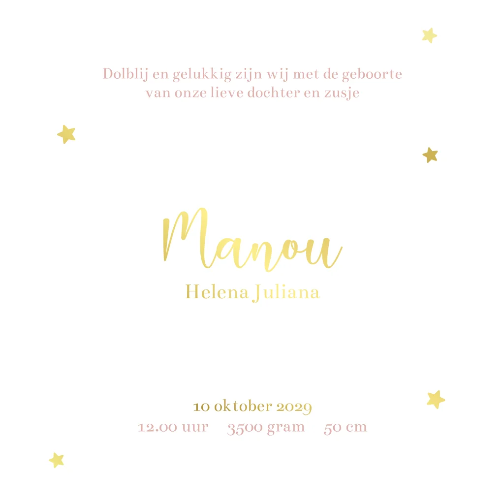 Een lief geboortekaartje met doorkijkvenster in de voorzijde van het kaartje. Dit geeft een leuk en speels effect aan het geboortekaartje. Door het venster kan je de naam van de baby zien aan de binnenzijde. Aan de buitenzijde is een patroon te zien van lichtroze waterverf strepen met sterren in foliedruk. De foliedrukkleur is nog aan te passen in de editor.