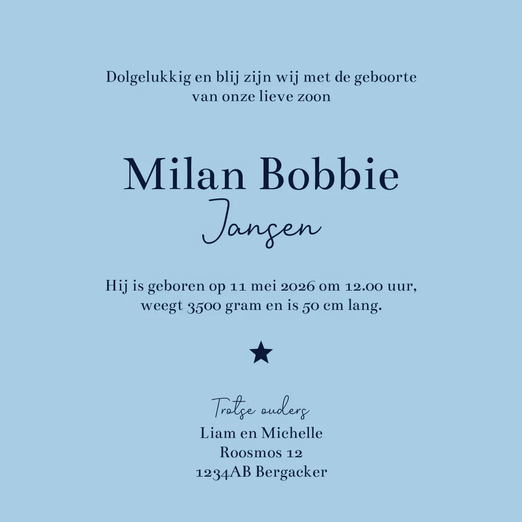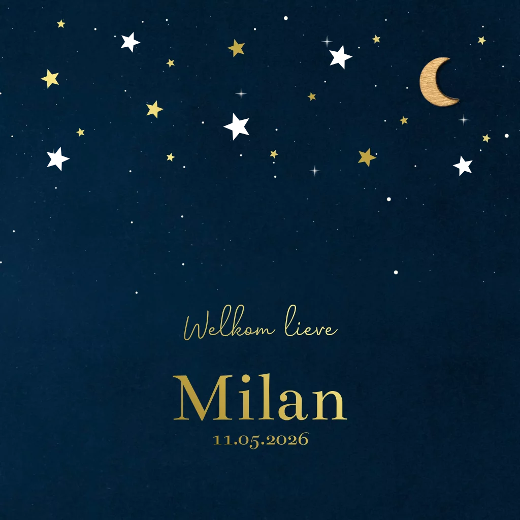 Geboortekaartje donkerblauw met foliedruk sterren en hout maantje